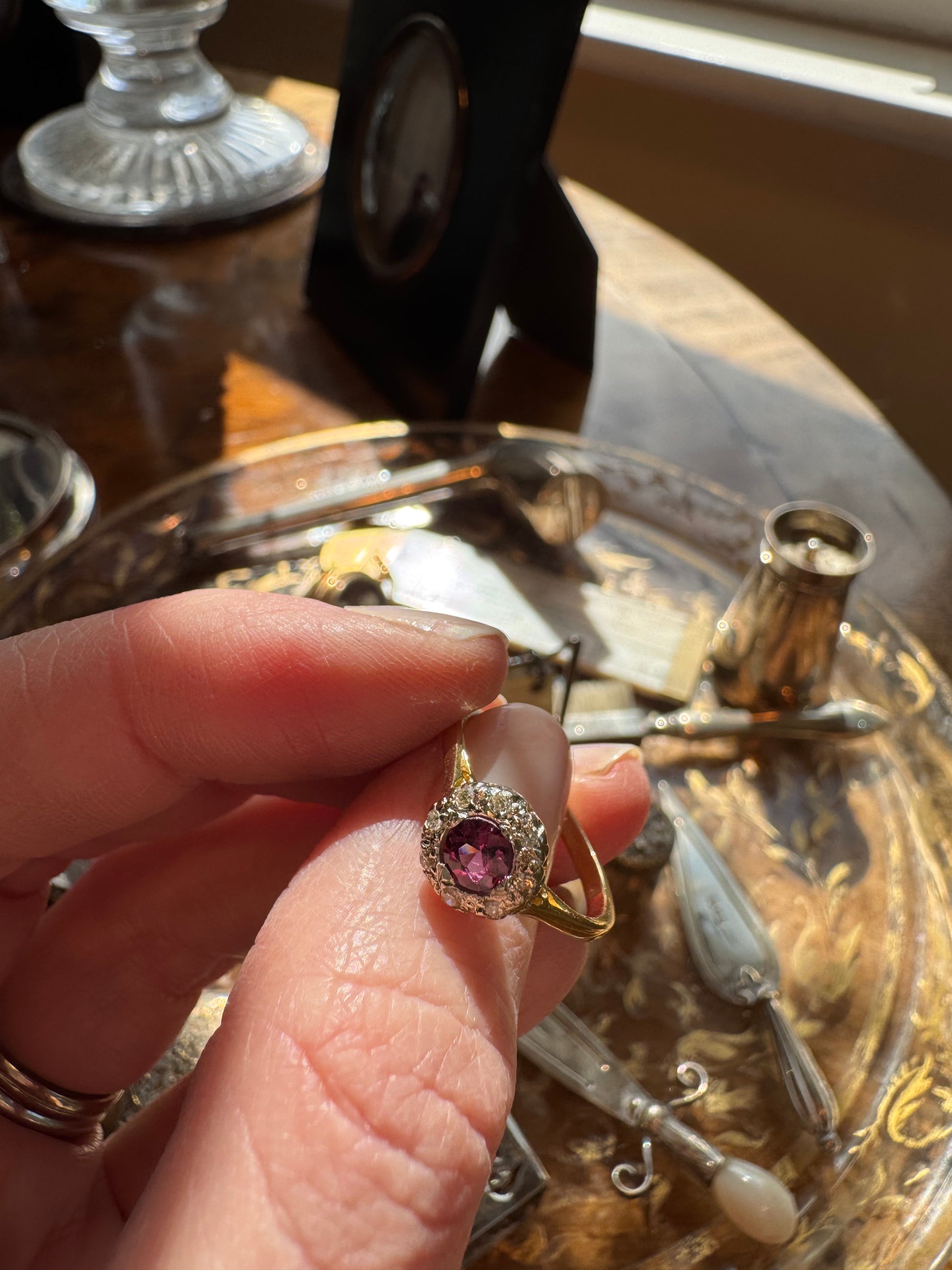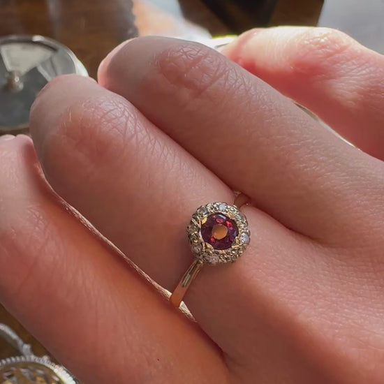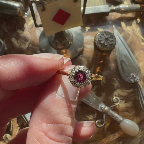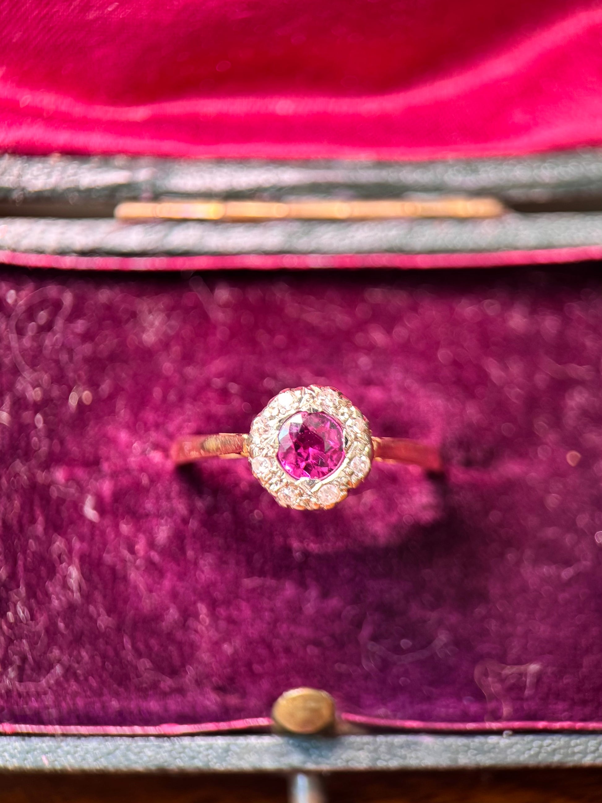 Antique 1920s cluster ring stamped “18CT” and “PLAT”. The band is 18ct yellow gold and diamonds set in platinum. The central stone is newly replaced. The original ring featured 4 small diamonds at the center, our jeweler replaced this with a larger stone - a beautiful 0.4ct pinkish purple tourmaline, making this a perfect engagement ring or everyday wear ring for anyone who loves pink or vintage style rings.