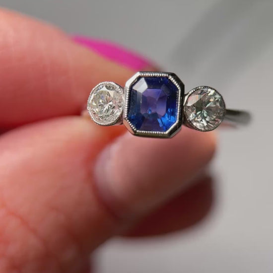 Art Deco style ring set with a large 1.06ct emerald cut unheated Burma natural sapphire surrounded by two large round cut natural diamonds, each 0.28cts for a TCW of 0.56ct. The central sapphire features a deep royal blue hue and the diamonds are extremely bright and lively.