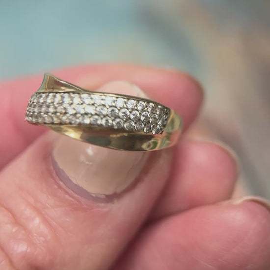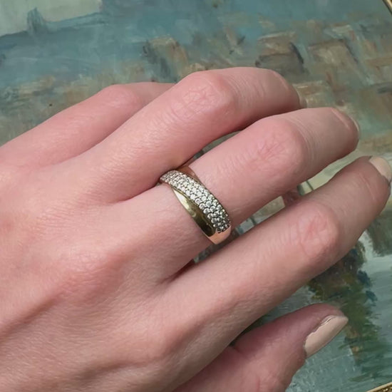 A stylish diamond and gold band ring, with a stunning array of diamonds set in a wide 9ct gold band. Stamped 375 for 9ct with import marks.