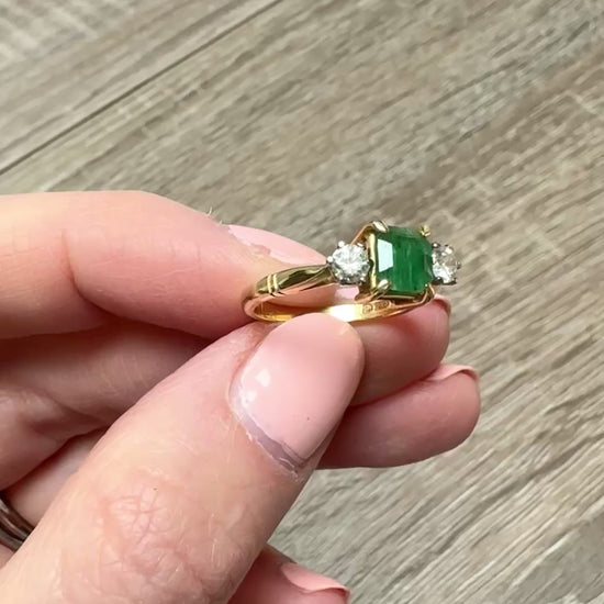 Vintage 18 carat yellow gold ring set with a large central Emerald surrounded by 2 diamond stones, UK ring size K 1/2. Stamped London, 1977. Emerald is a medium green hue and diamonds are lively and bright. Ring is of good condition commensurate with age.