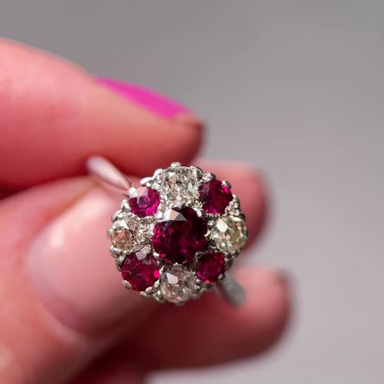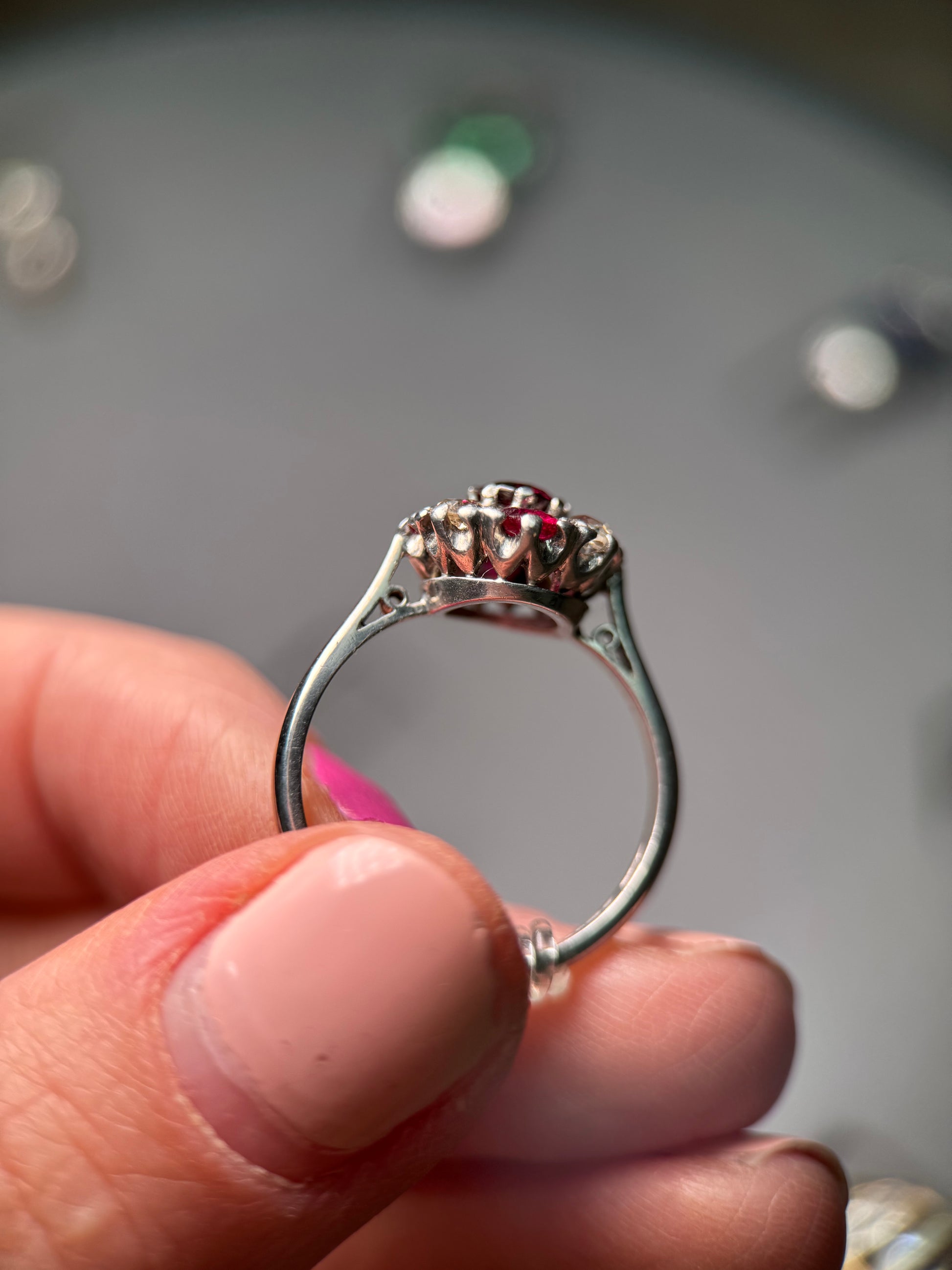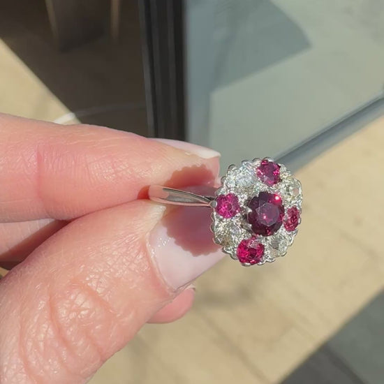 Beautiful vintage ring set with natural Thai rubies and natural diamonds, set in an 18ct white gold band. Band hallmarked 18ct, Birmingham 1993 and with makers mark “CLM.”